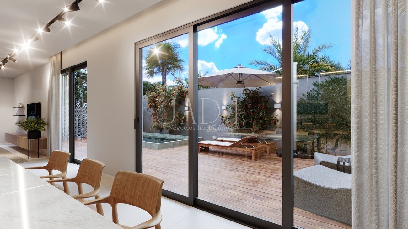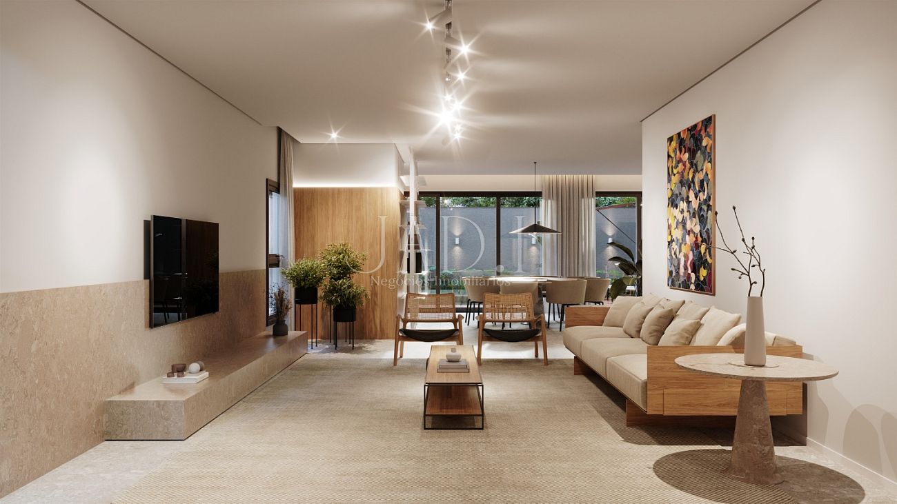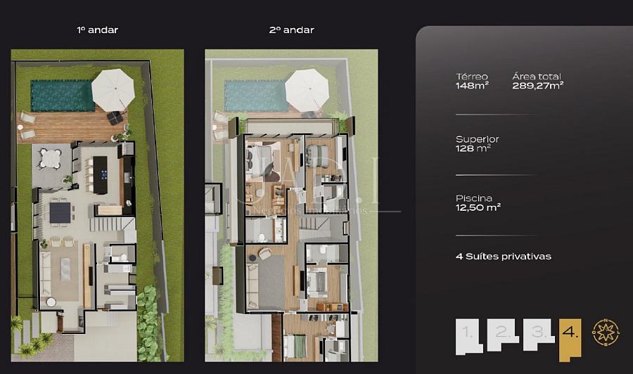 Com 289,27 m² privativos distribuídos em dois pavimentos, o imóvel se destaca por seus ambientes amplos, integrados e bem iluminados.