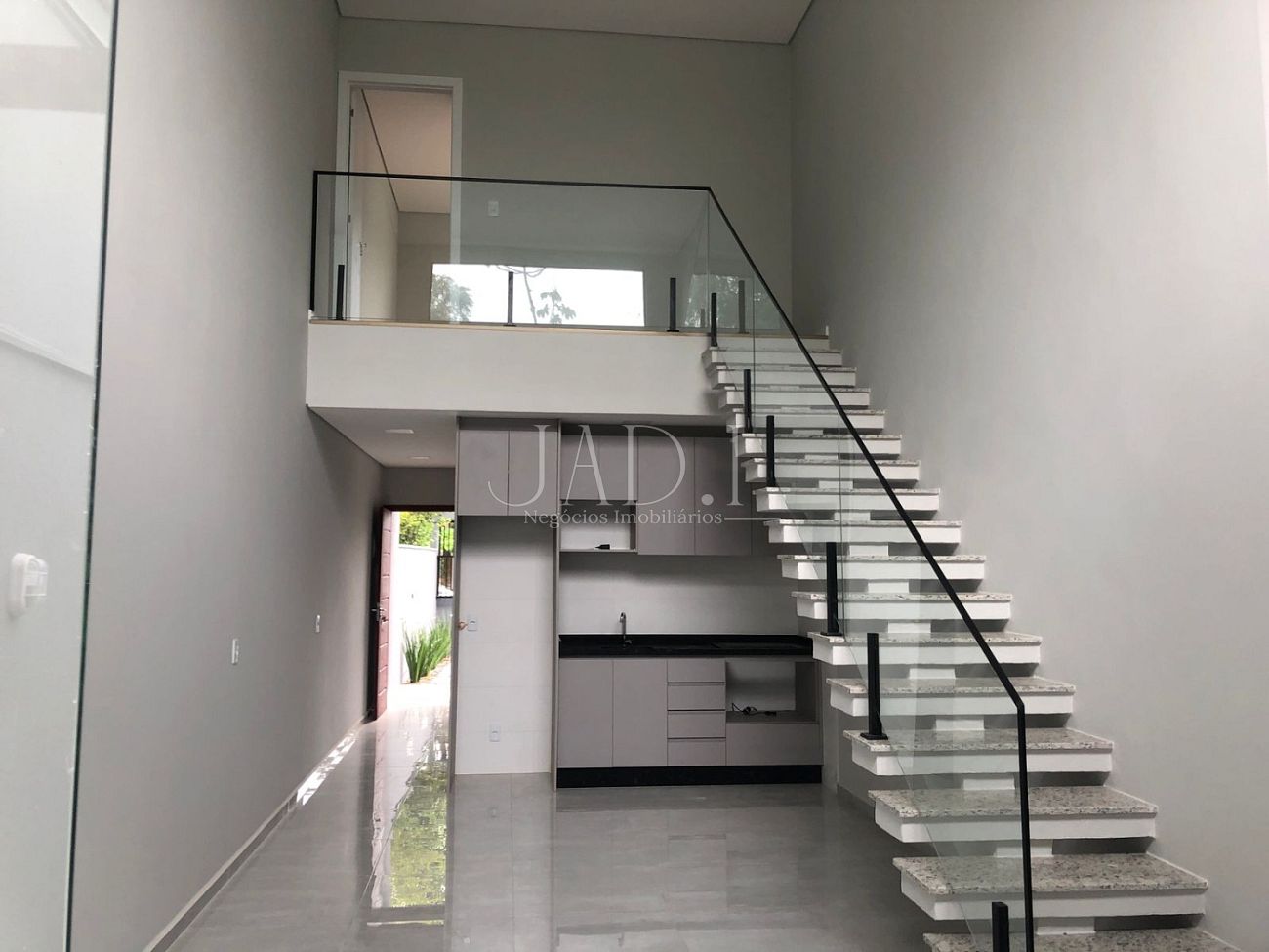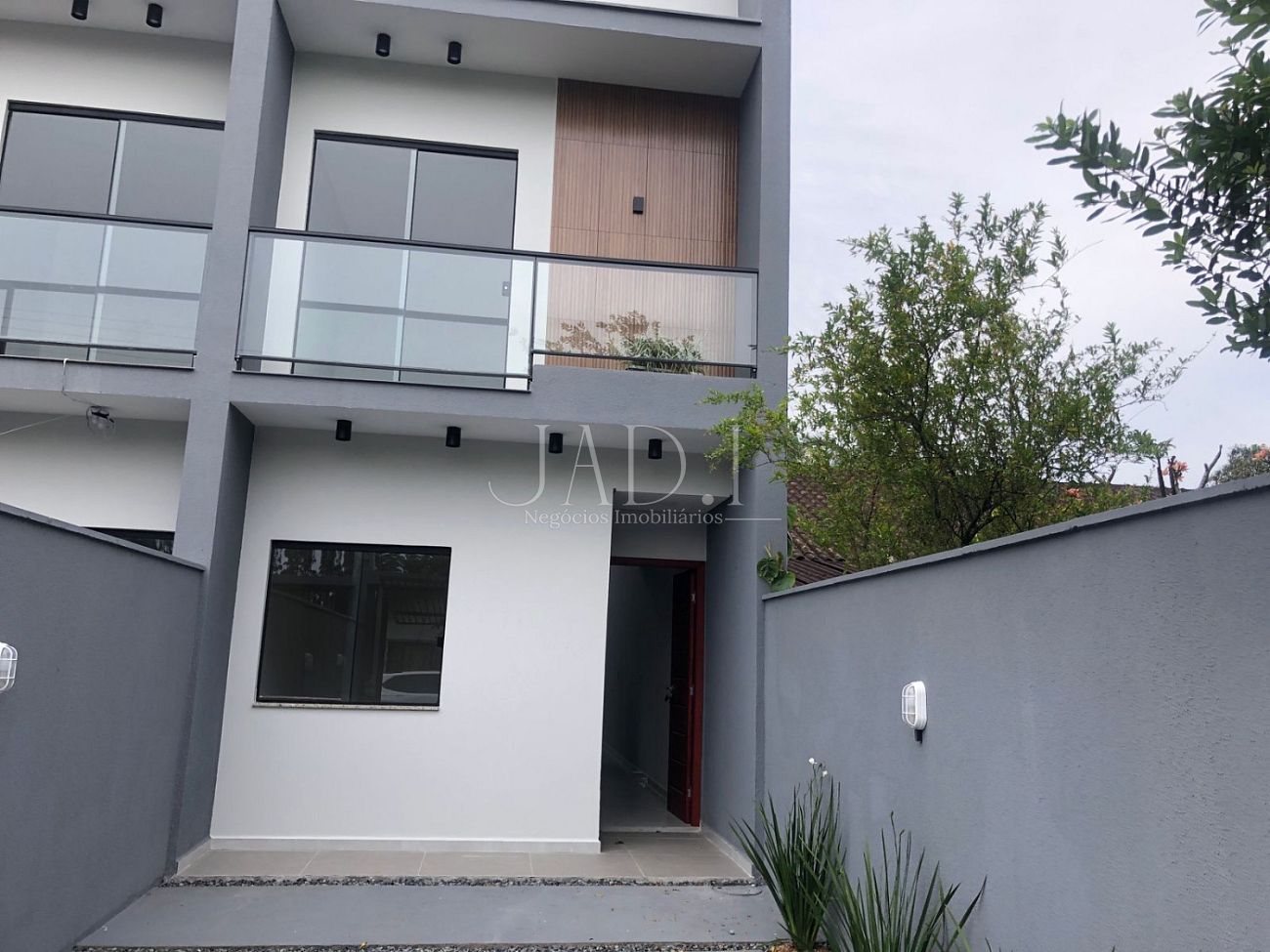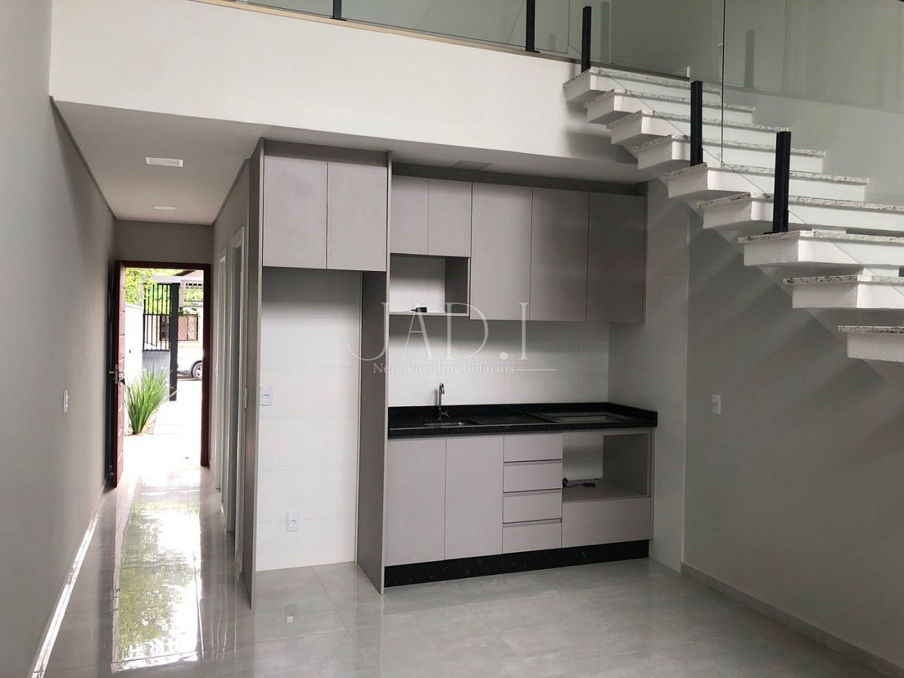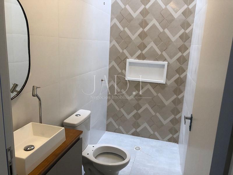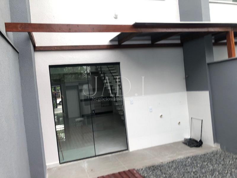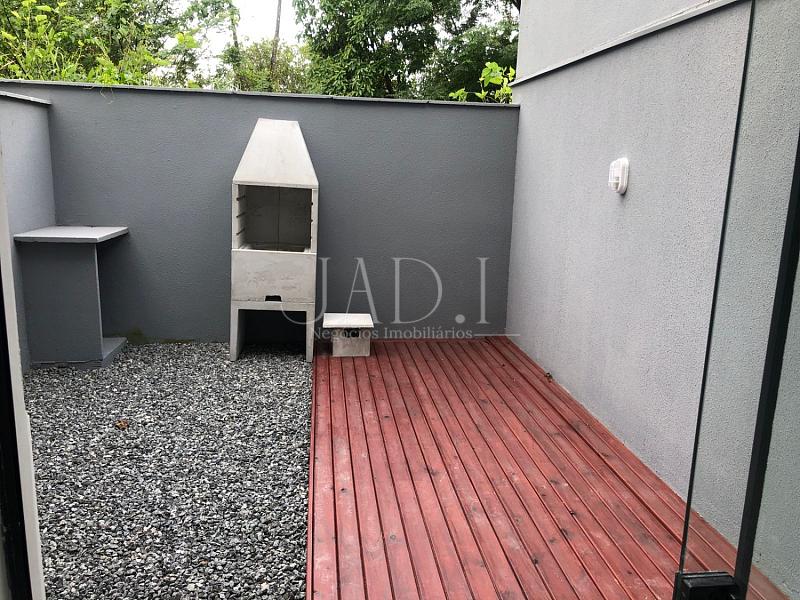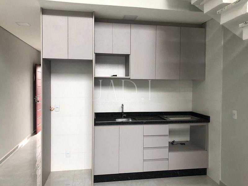 Casa nova, estilo sobrado para locação, com móveis de cozinha, banheiro e churrasqueira na parte externa com deck.